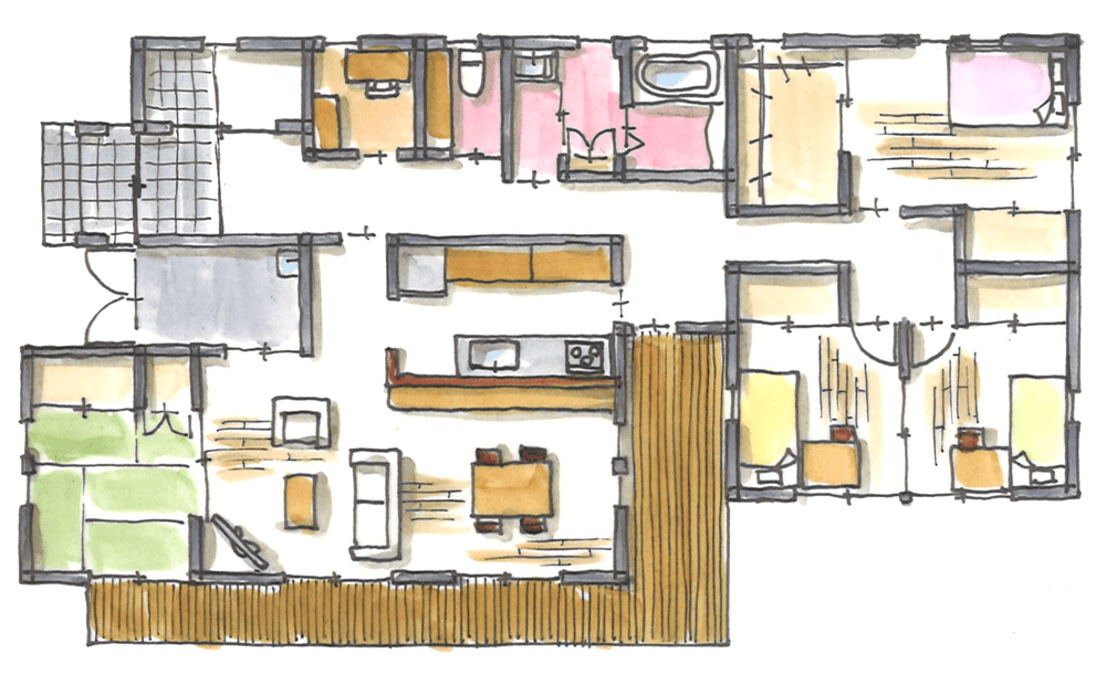 クールで家事ラクなビルトインガレージ付きの平屋幹工務店の間取り例 くふうイエタテ。