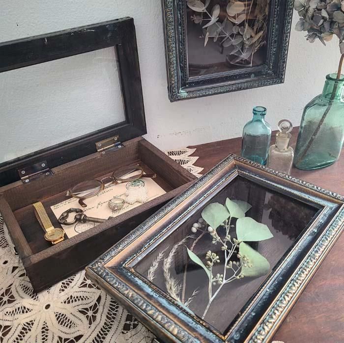昭和レトロ・壁掛け可能ガラスケース・ふた付き・ディスプレイケース・額縁リメイク・ドライフラワー付き旅するレトロ雑貨店monochrome モノクローム。