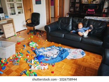 変な表情をした可愛い1歳の少年が、とても汚いリビングで遊び、ソファに寝転がり、テレビを見ている写真素材1026758944Shutterstock。