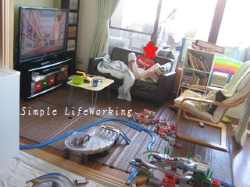 夜のリビング、朝のリビング。 ※全く片付けていないので汚いです。 ブランコにはいつも物置き。