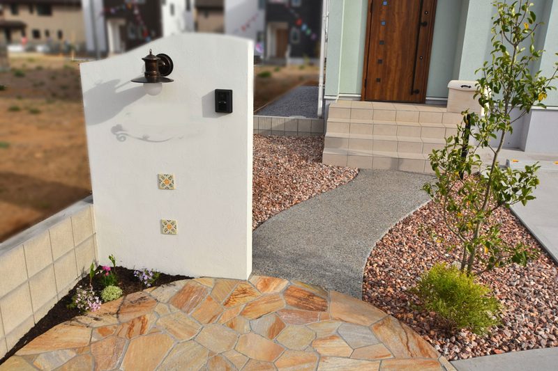 コンクリート洗い出し仕上げと自然石貼り玄関アプローチ 磐田市Y様邸浜松・磐田・袋井のエクステリアならハマニグリーンパーク。