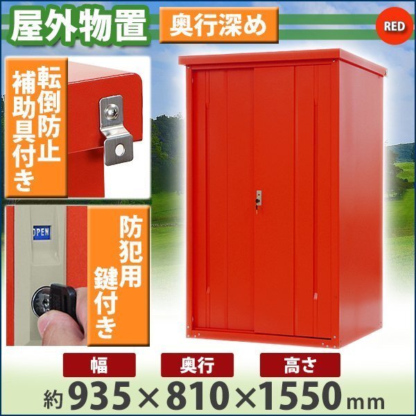 送料無料 屋外物置 スチール製 家庭用収納庫 鍵付き 赤 幅約935mm。