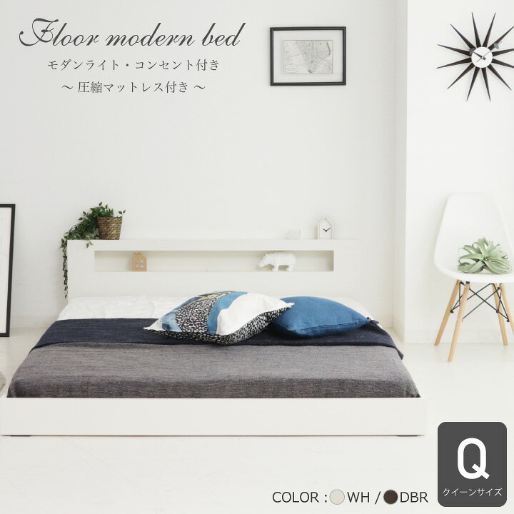 ベッド クイーン ベッドフレーム クイーンサイズ 圧縮マットレスセット クイーンベッド ベッドフレーム コンセント付き ポケットコイル 宮付き 木製フロアベッド ローベッド ベット 北欧 モダン ホワイト ダークブラウン 白 安い 人気 コンパクト 送料無料 sanjp-0335。