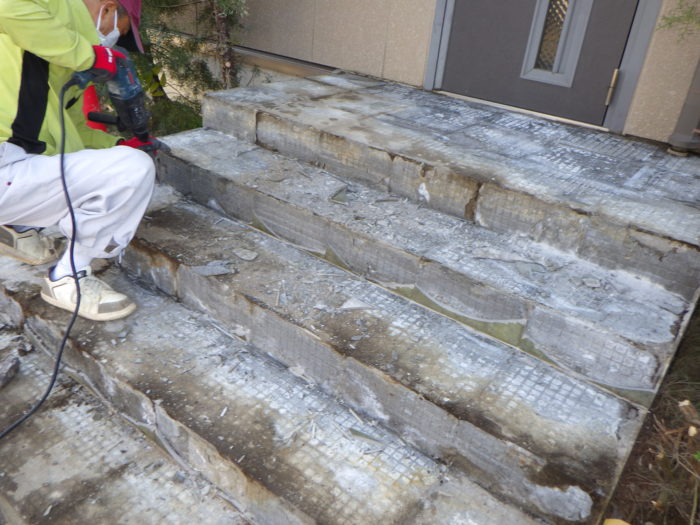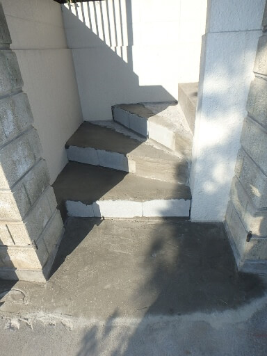 モルタル階段破損 足場を落として欠けた所をリペア 神戸市住宅キズ補修・リペア補修施工大阪のオカショウ・リテック。