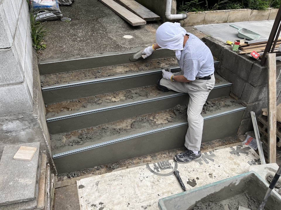 階段モルタル仕上げ 夏場の階段モルタル仕上げは、暑さとの戦い🪖🥵左官左官業モルタル階段外構エクステリア左官女子DIYプラスター砂セメントいわき市山悠工業株式会社。