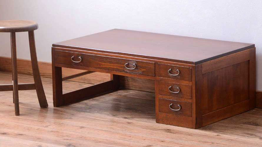 木製文机 片袖4引き出し ちゃぶ台 書斎机 昭和レトロ 茶色 家具。