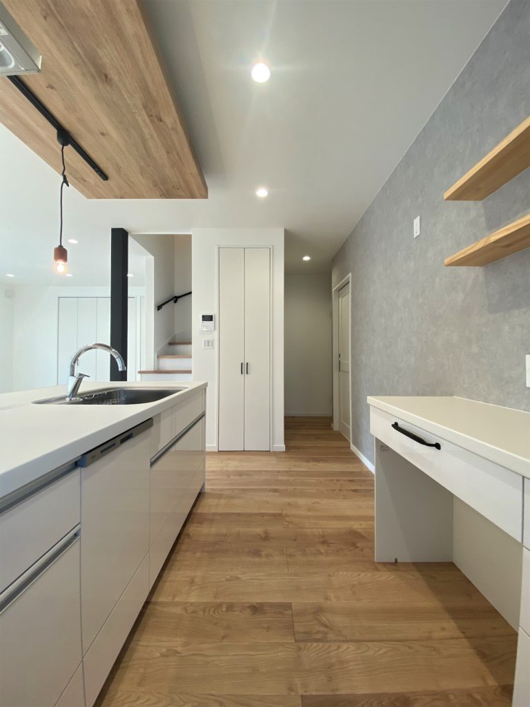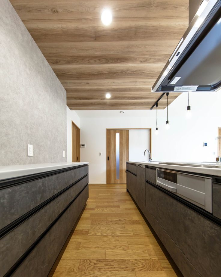 おしゃれな木目天井×グレーキッチン下がり天井木目調クロス天井 クロスオフェリアJK800Cモダンキッチン照明ペンダントライト福岡工務店新築一戸建て注文住宅タカラスタンダード。