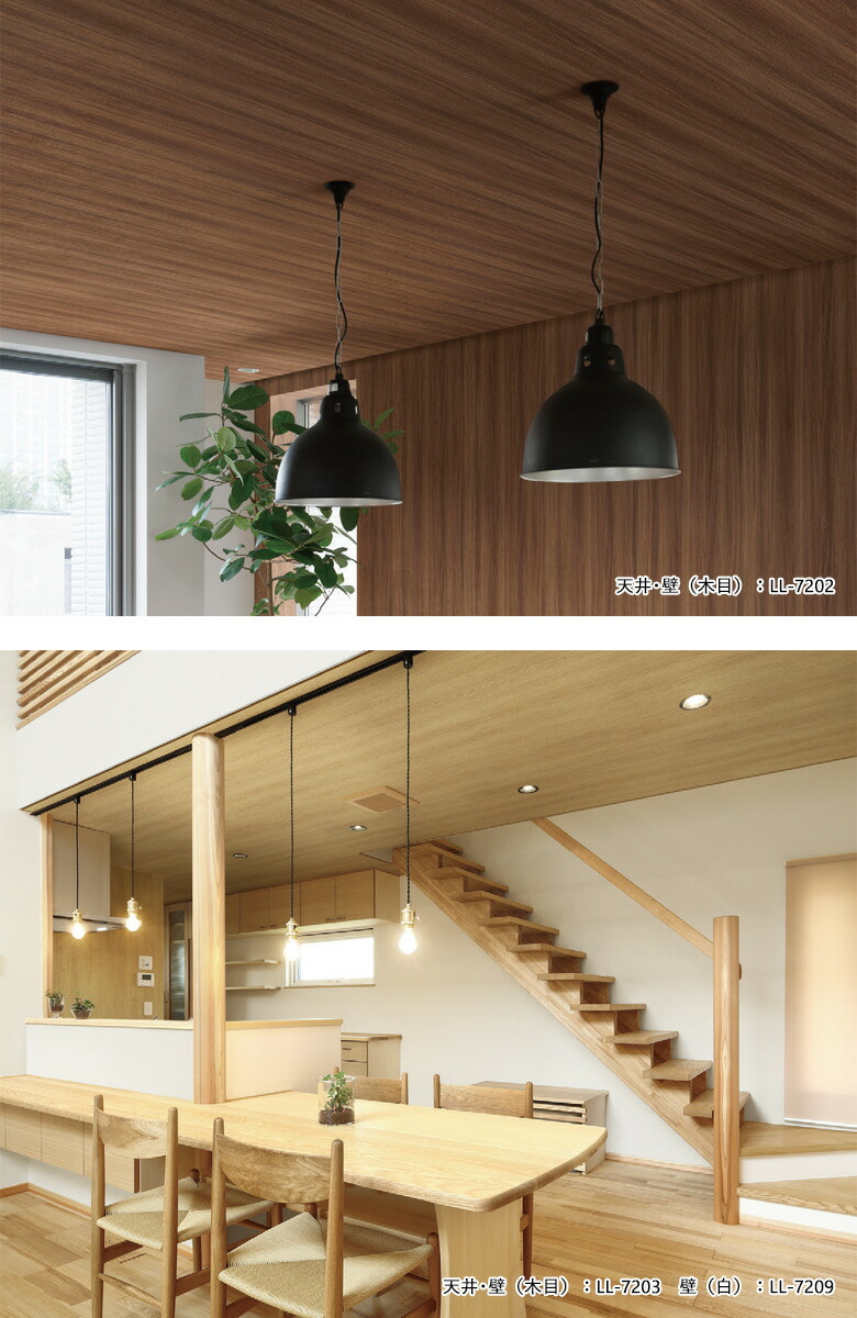 壁紙 木目調 ナチュラル 天井 おしゃれ diy 賃貸 リフォーム 貼替 リビング リリカラ V-wall クロス のりなしビバ建材壁紙クッションフロア店。