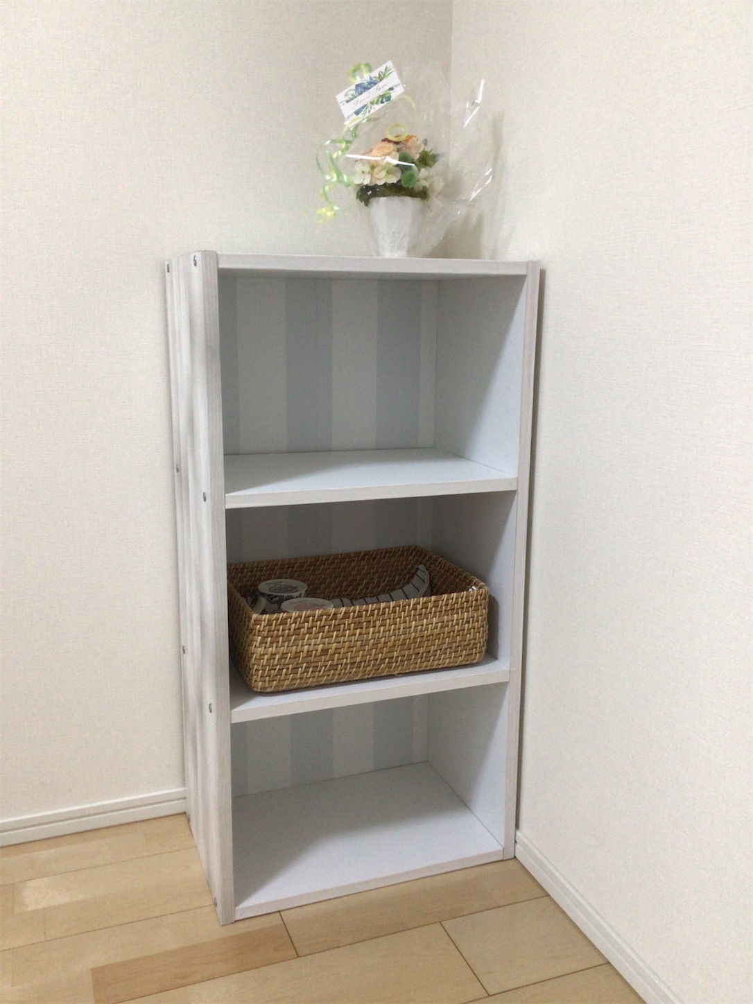 カラーボックスの背板を100均リメイクシートでアレンジ。おしゃれな壁紙も ブログレポート。