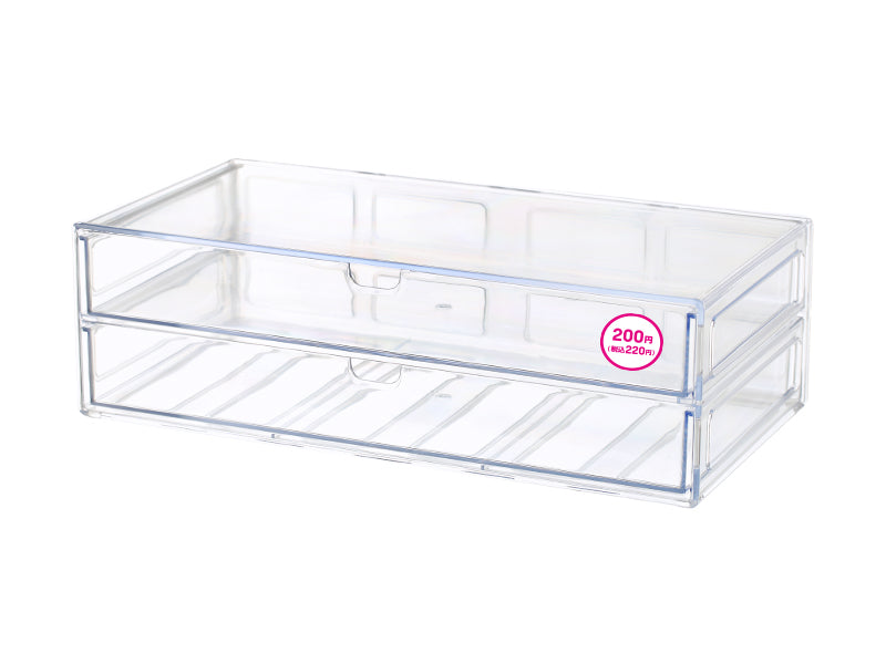 2個セット ダイソー重なる透明収納ケース 1段引出し、18cm×13.5cm×9.5cm。