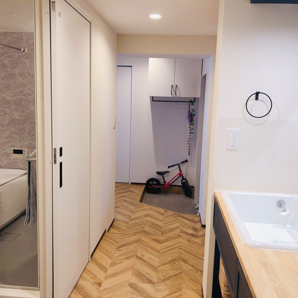 廊下に造作洗面台って便利なの?間取り図で動線解説マンションリノベーション事例中古マンションリノベで快適生活。
