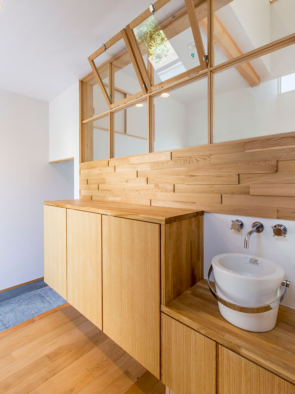 ホワイトと木でまとめられた シンプルな空間. 廊下の突き当たりに設けた 造作洗面台は 高窓からの光を取り入れて 明るい印象に. 洗面台下を活用した収納で見た目スッキリ! =================== 松尾建設は神奈川県茅ケ崎市で 「アトリエ建築家と。