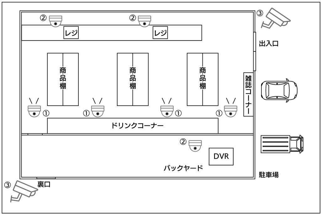 コンビニエンスストアへの防犯カメラ設置シュミレーションNSKダイレクトショップ。