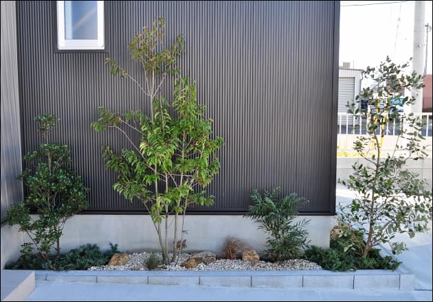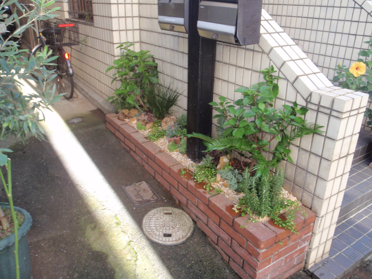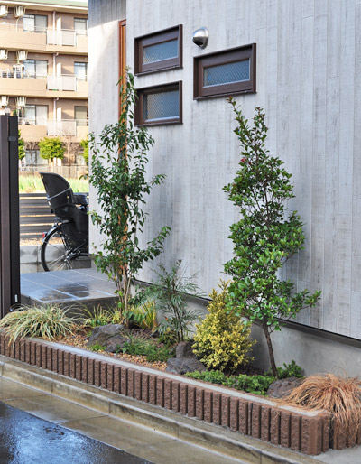 玄関前と道路沿いの花壇へおしゃれな植栽デザインを-豊島区K様邸植栽の施工例千葉県 東京都の造園 植栽 庭施工造園業専門店 新美園。