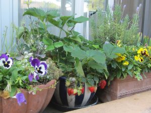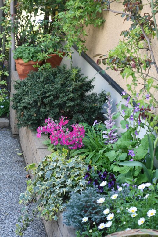玄関脇の3段花壇のようす : ほんの小さな庭。