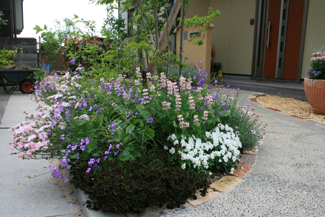玄関横の細長い花壇を彩る植栽レイアウト-茂原市T様邸アプローチガーデン・スモールガーデン,植栽の施工例千葉県 東京都の造園 植栽 庭施工造園業専門店 新美園。
