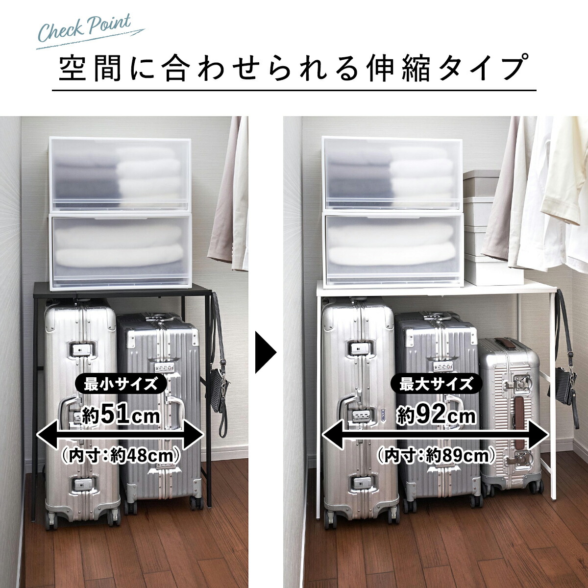 山崎実業 伸縮キャリーケース上ラック タワー tower クローゼット 押し入れ 収納 伸縮 整理棚 収納棚 押し入れ収納 ラック 押し入れ収納棚幅51~92cm 奥行45cm クローゼット 洋服 ハンガー 衣類収納 すき間収納 ホワイト ブラック 4370 4371 57-437シリーズ別。