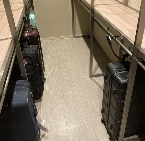 カプセルホテルでスーツケースはここに置く。広げるときはここ使え。