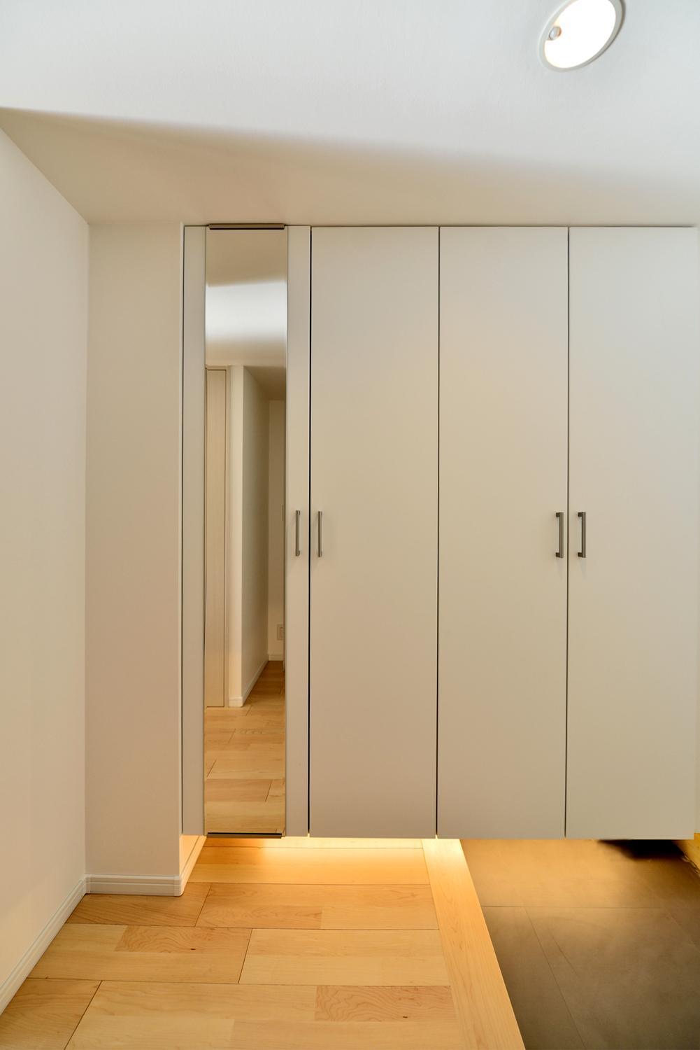 足元に間接照明のある玄関収納 ハードメイプル×北欧風のやわらかな住まい- 玄関事例SUVACO スバコ。