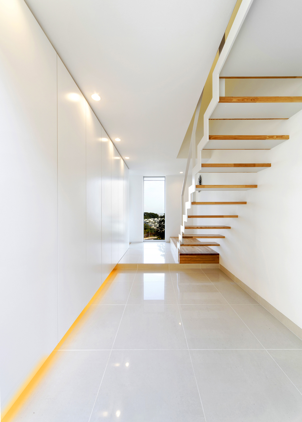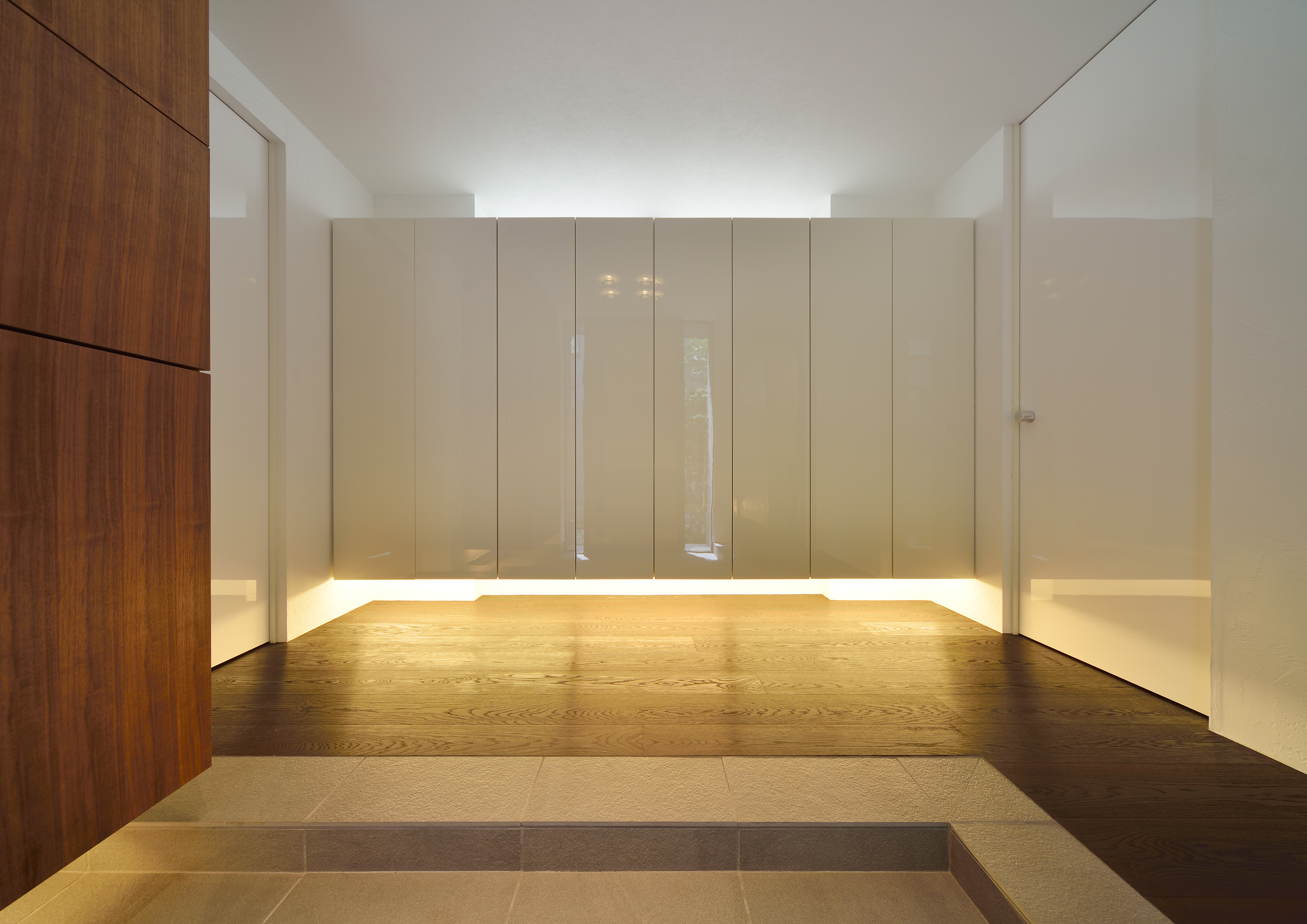 足元の間接照明が映えるシンプルでモダンな空間が魅力の玄関 - 事例写真「モダン3階建ての家」注文住宅のハウスネットギャラリ。