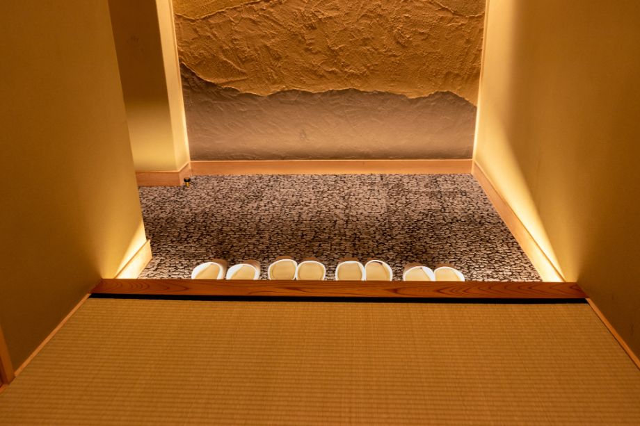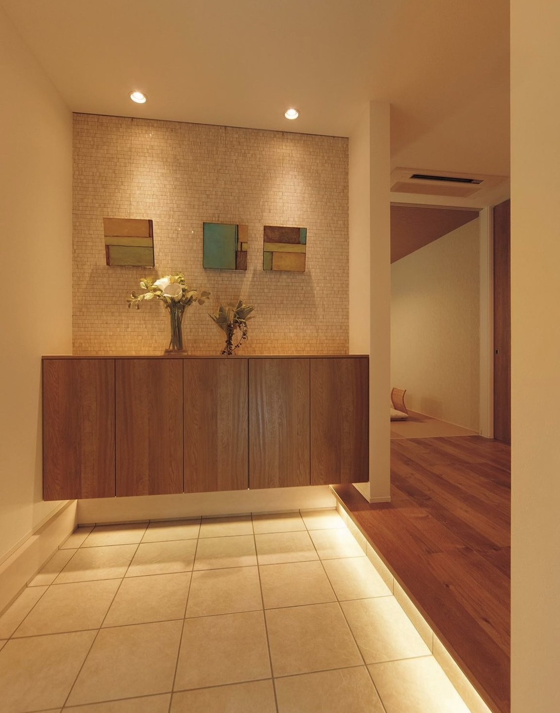 足元の間接照明がおしゃれな玄関 くふうイエタテ。