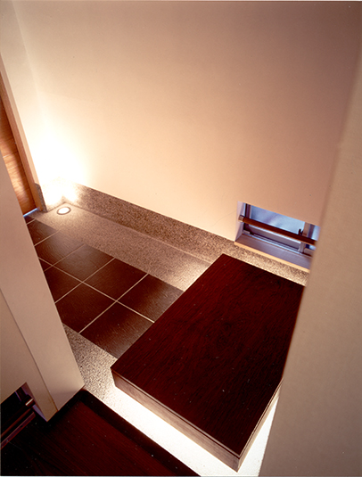 株式会社小堀建設栃木の新築注文住宅* * 間接照明が足元を柔らかく照らす玄関。土間につくったベンチは、ブーツを履いたり小さな子に靴を履かせたり、ちょっと荷物を置く場所になったりと、何かと便利です。お客さまをお出迎え・お見送りするのにふさわしい。