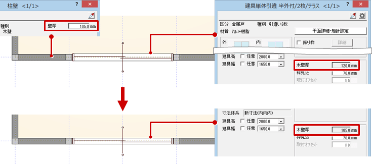Q:建具属性の「木壁厚」と壁の厚みが合っていない場合の対処方法を教えてください。