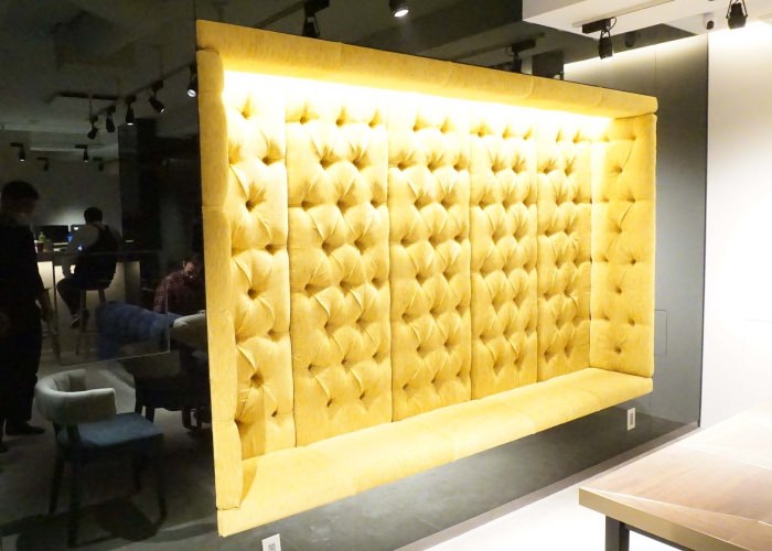 壁布団張り 布団張り壁レザー張り レザー張りled電飾ブロック張りフロッグレザー店舗家具ネットヤマダ家具工芸クラブ。