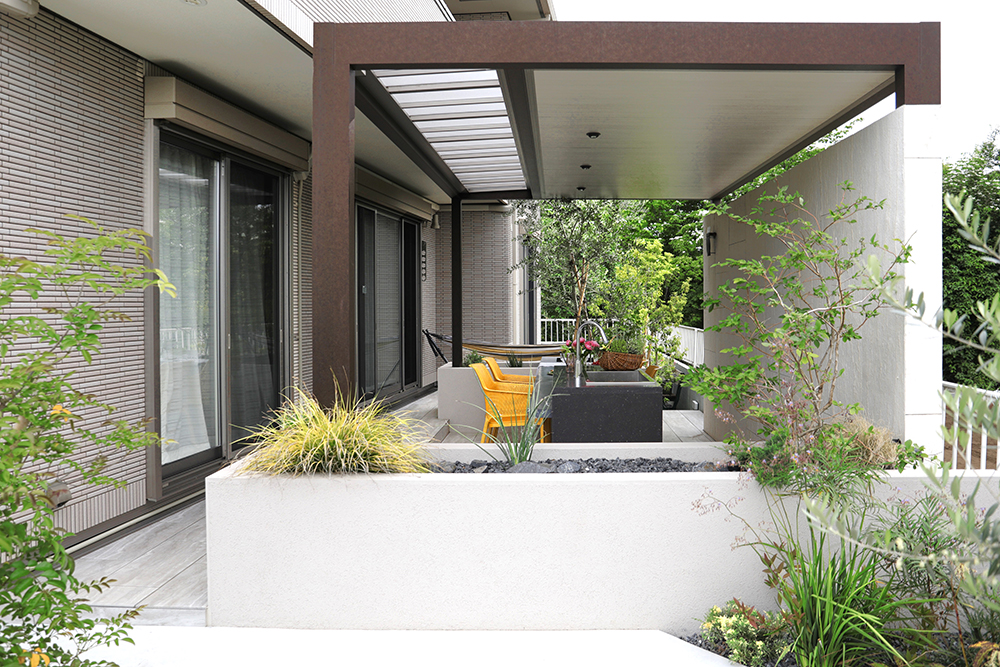 シェード付きのテラスでくつろげるお庭へグリーンケアお庭と外構、エクステリアのデザイン&リフォーム。