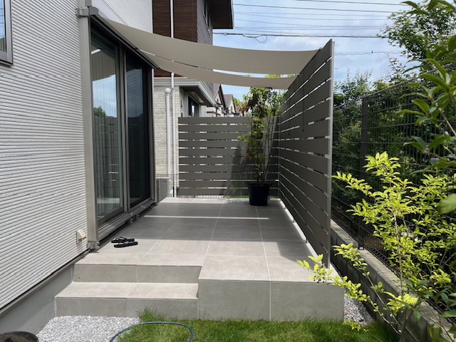 目隠しを兼ねた日除け シェード とプライベートを区切るフェンスのご紹介スタッフブログ 宗像店 エクステリア・ガーデン・外構・造園グランド工房。