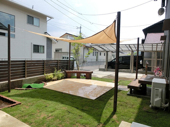 日除けとタイルテラスの過ごしやすいお庭スタッフブログ 横浜北店 エクステリア・ガーデン・外構・造園グランド工房。