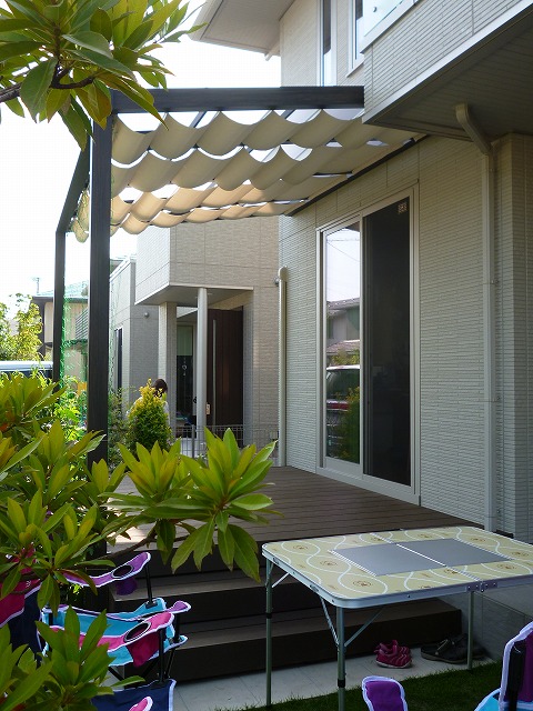 風が通る心地よい空間づくりのための「オーニング・シェード」によるお庭の日除け・紫外線対策外構・エクステリア・造園は庭づくり専門店 愛知県扶桑町 池之上造園へ。
