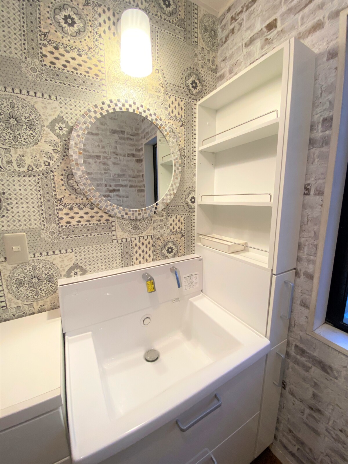 丸い鏡がオシャレな洗面化粧台へ 松戸市施工事例リフォーム創研。