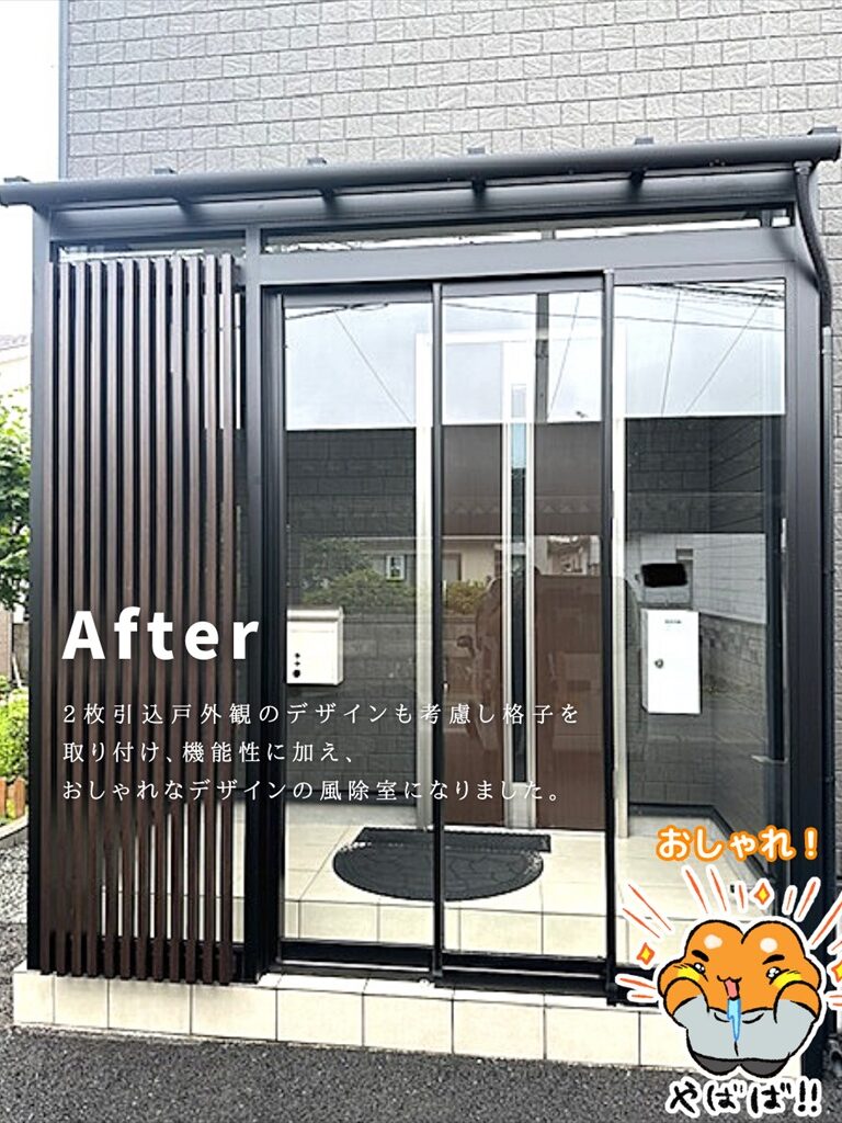 風除室を後付けしておしゃれで機能的な玄関へ!リクシル風除室施工例ダルパ旭川市窓・玄関ドア・エクステリアリフォームのプロショップ。