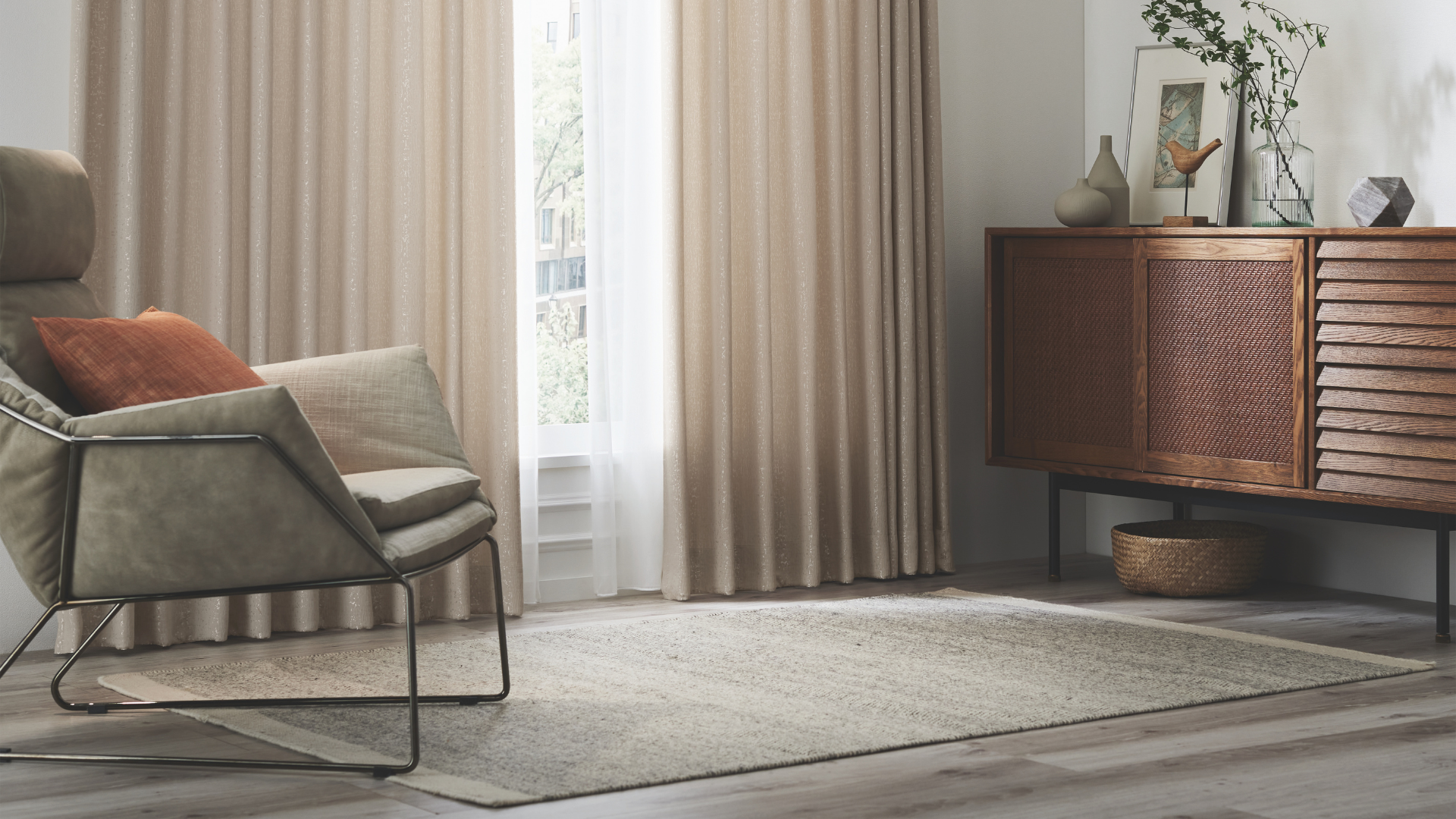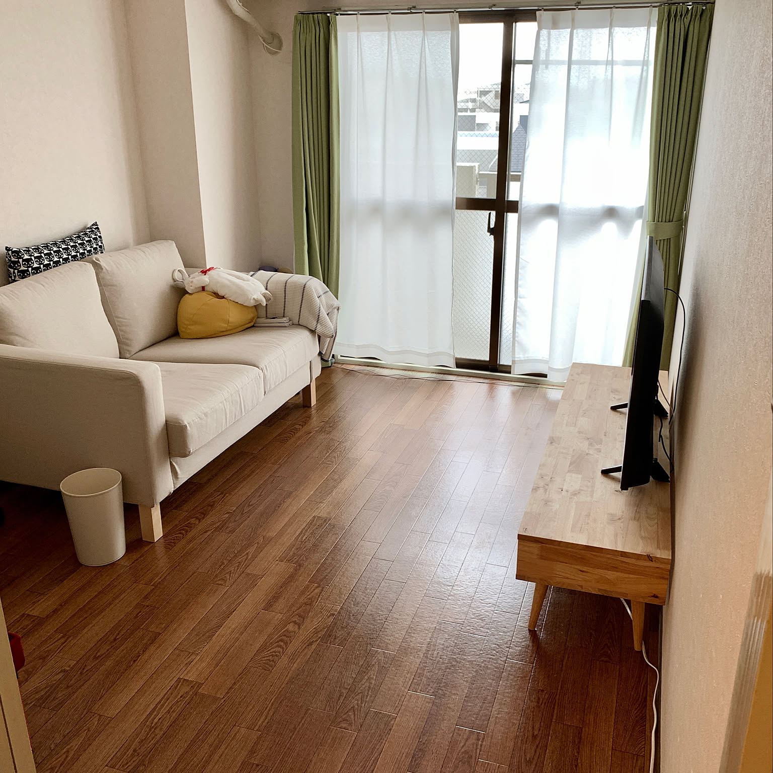 カーテン選びの参考に。ナチュラル ライト ブラウンの床に合わせたコーディネート事例。
