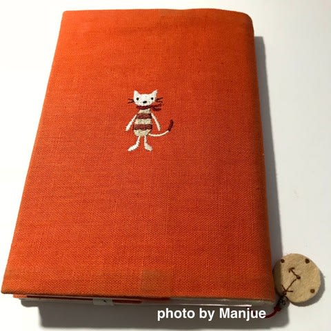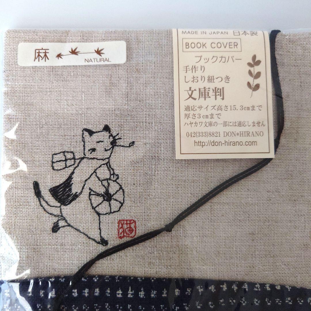 ドン・ヒラノ DON HIRANO ブックカバー 猫 ねこ えんじ 麻 文庫判。