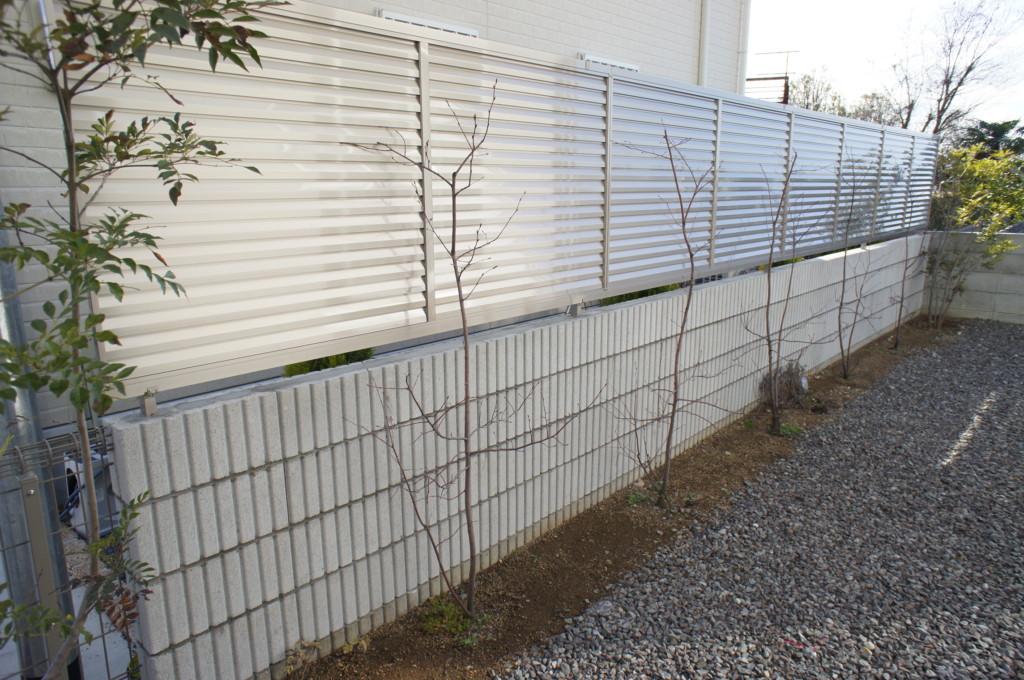 No.125隣家のブロック塀を隠し、お庭を明るくするホワイトルーバーの設置目隠しフェンス・ウッドデッキ専門店のエコウッド。