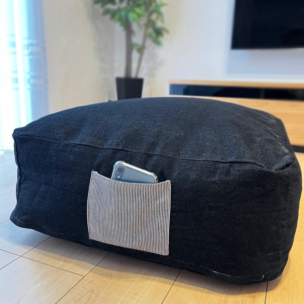 黒デニムのクッションになる布団収納袋グローバルガーデン。
