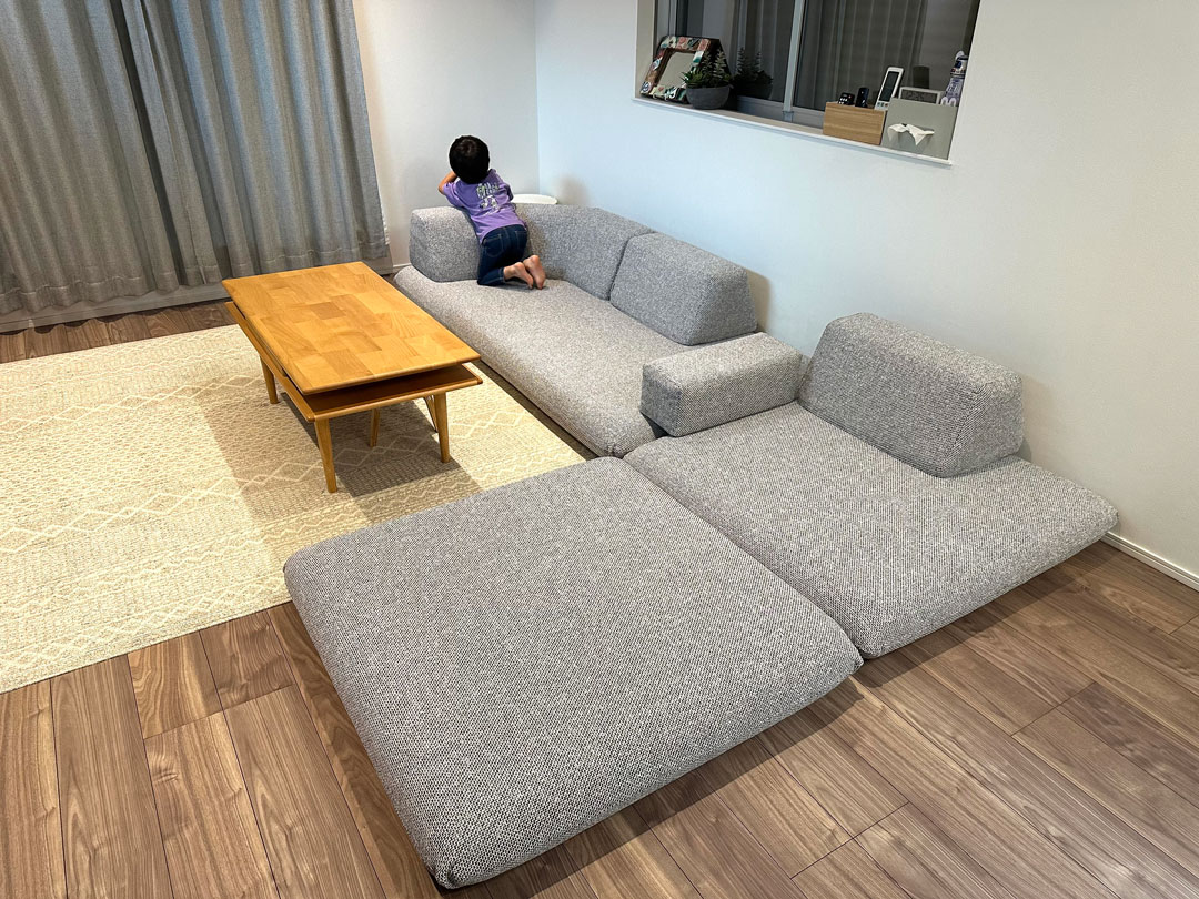 背なしソファ、フラットソファだからできるソファの活用術!ソファを縦置きすると前後を向いて座れる!家具なび~家具の使い方を提案するブログ~名古屋・インテリアショップBIGJOYが独自のアイデアで家具の配置術などを提案。