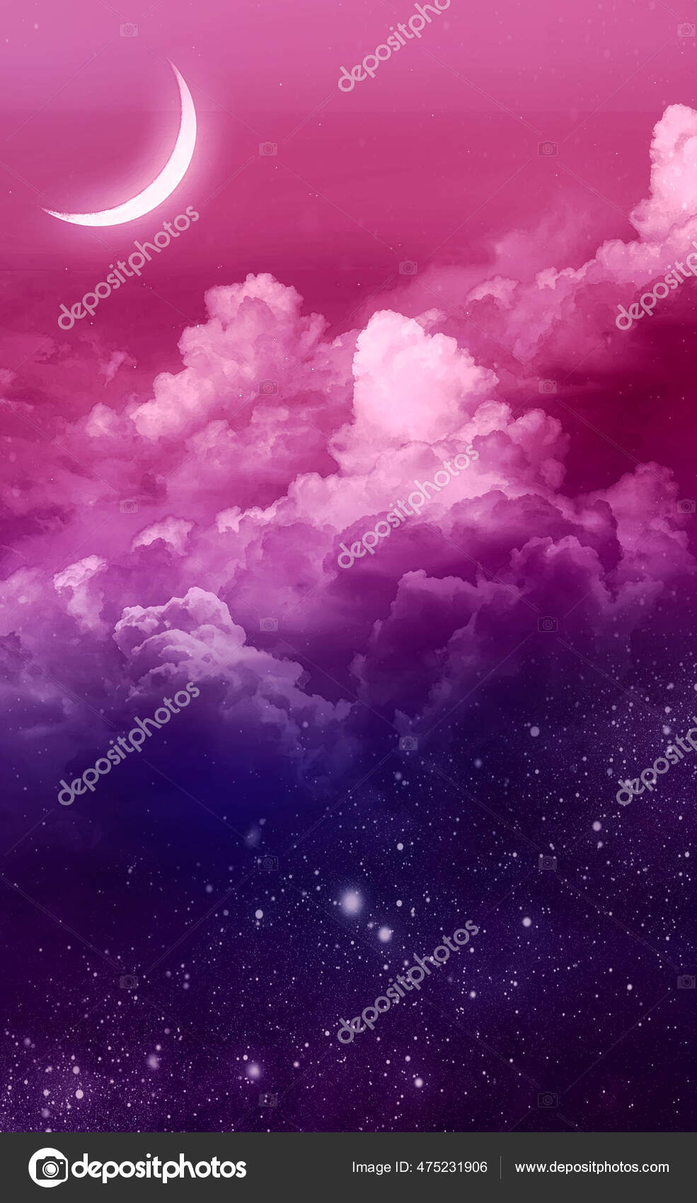 深い空間に月と明るい星が輝く魔法のようなピンクの風景 柔らかいふわふわの雲と紫色の宇宙の空を持つ穏やかな おとぎ話の背景 — ストック写真 ©zenitkalk92.gmail.com475231906。