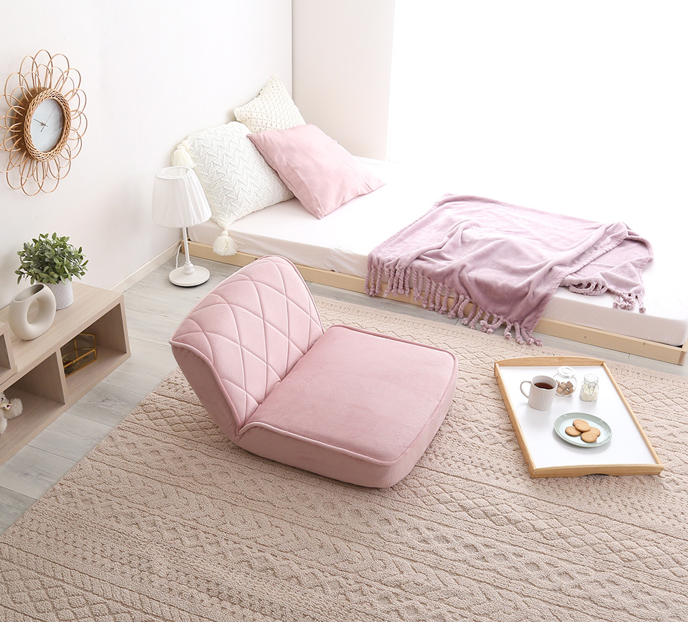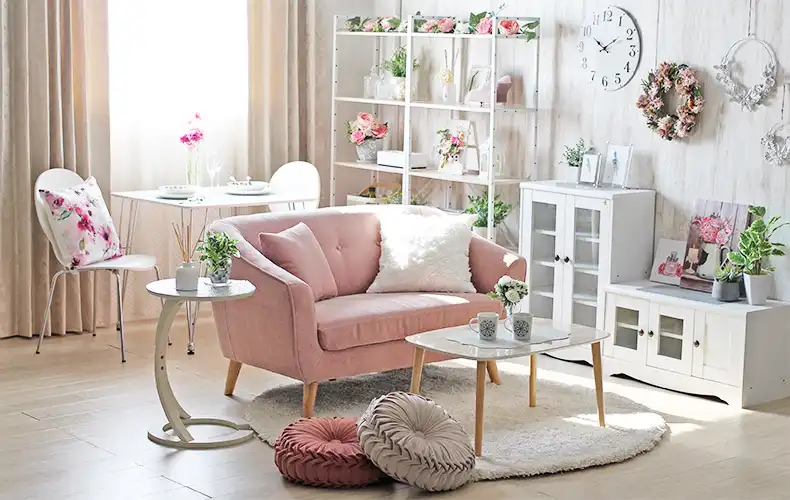 通販 甘くなりすぎない、主役のピンクソファで大人の女性らしいフェミニンな空間に。