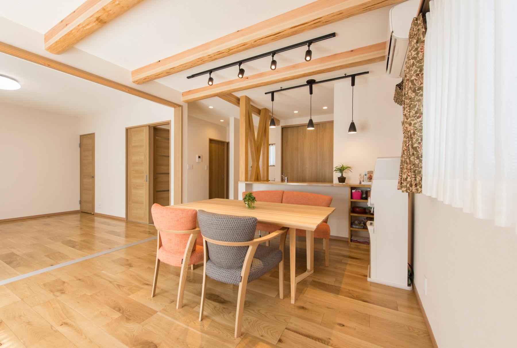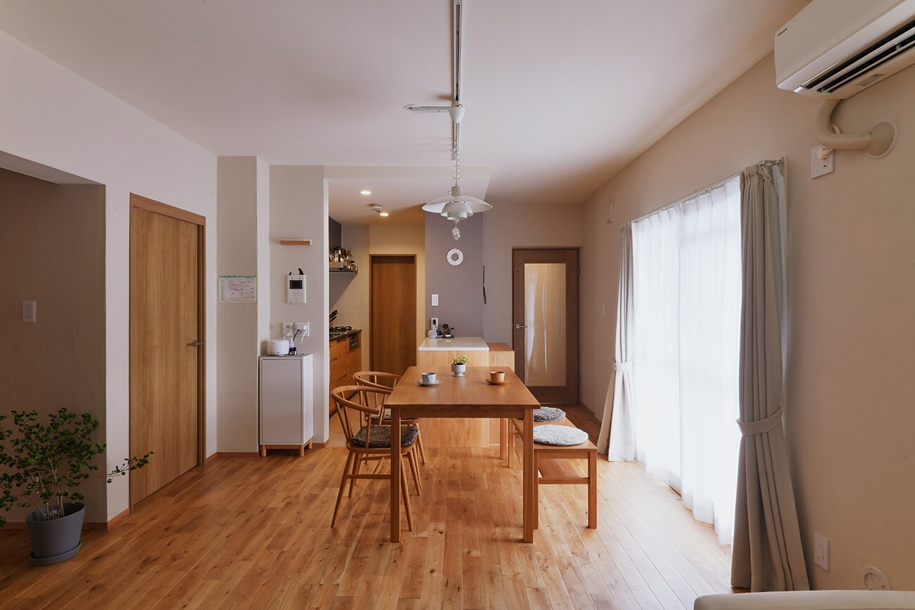 北欧風のシンプルな家具が際立つ明るい空間のダイニングとリビング -事例写真「タモの綺麗な木目と和のヒュッゲインテリア」注文住宅のハウスネットギャラリ。