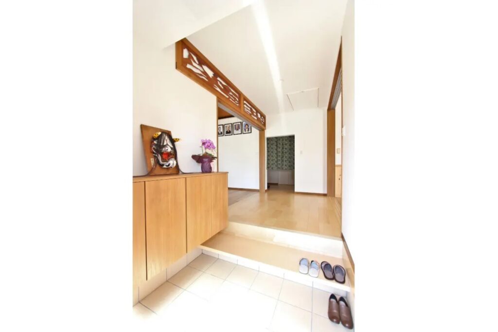 腰掛け待ち合いのあるバリアフリーの和風な玄関 - 事例写真「三郷の家」注文住宅のハウスネットギャラリ。