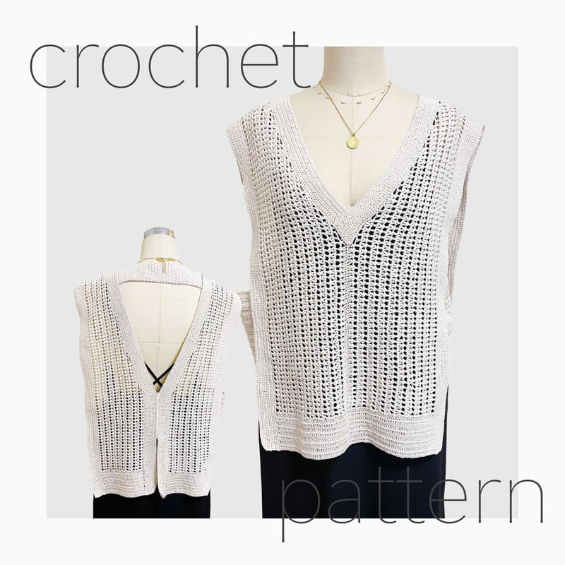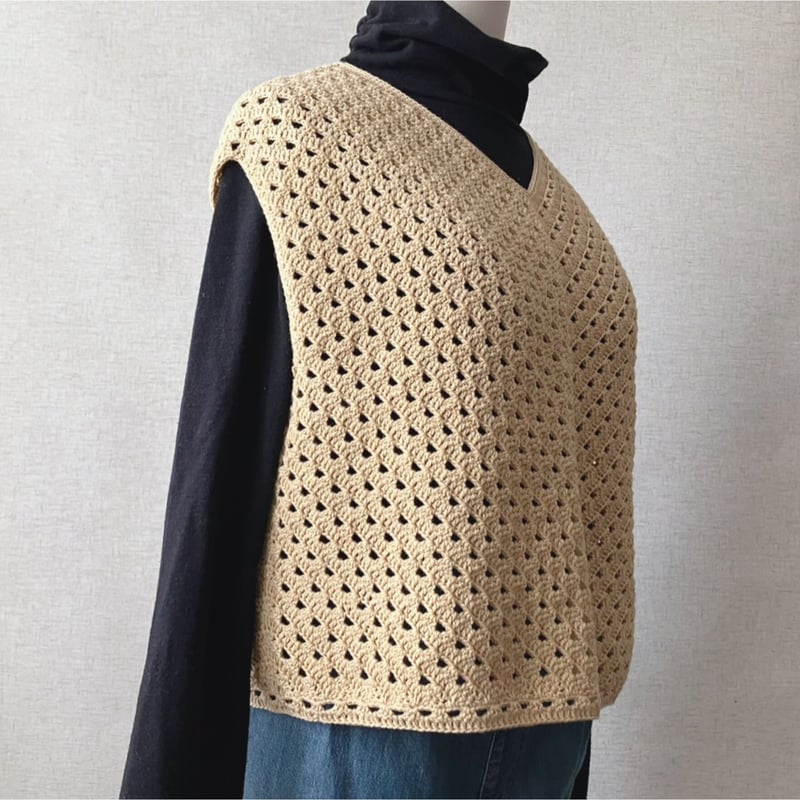 1回完結レッスン かぎ針編み Vネックベストの編み方 PDF編み図付編み物。