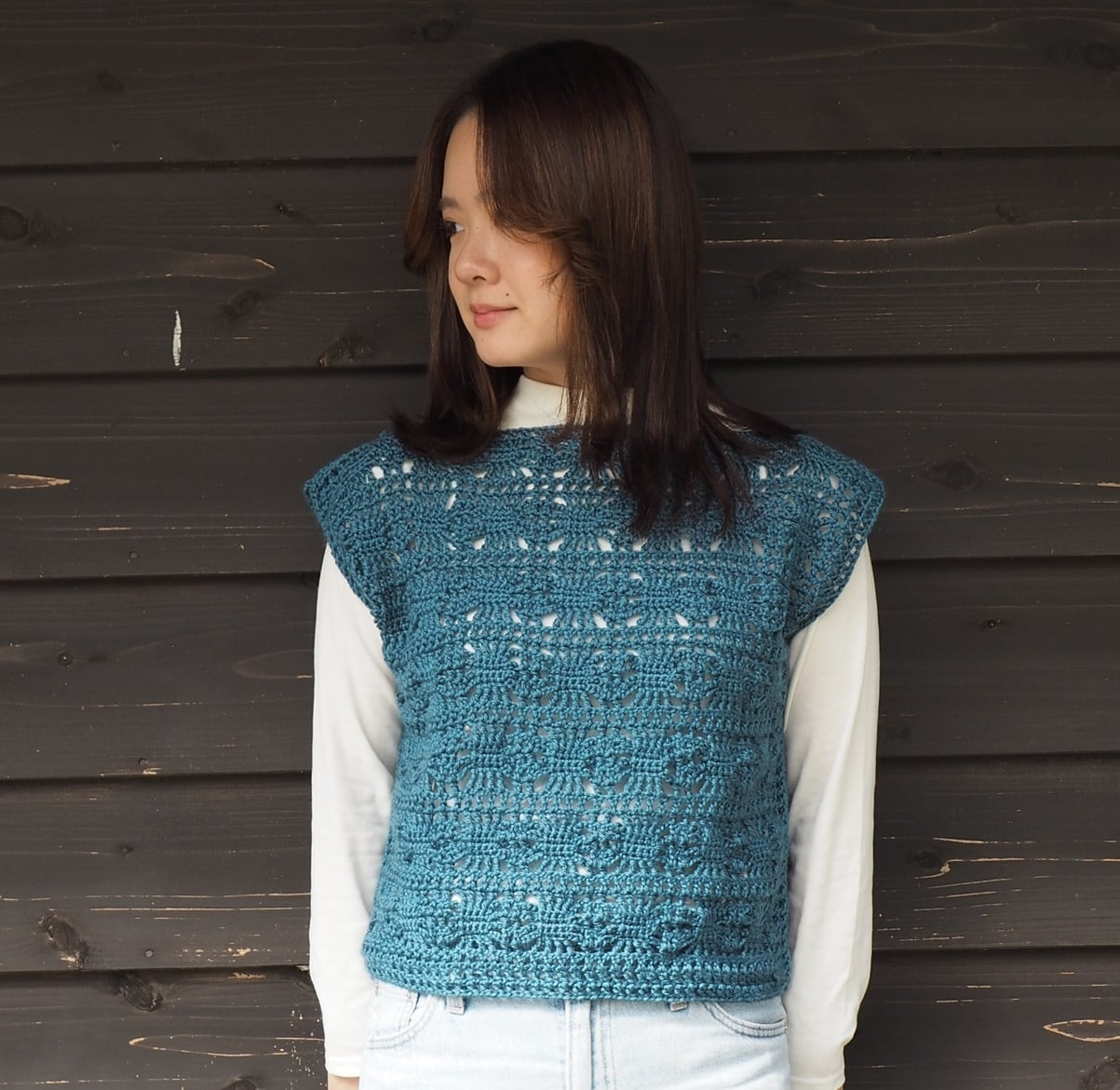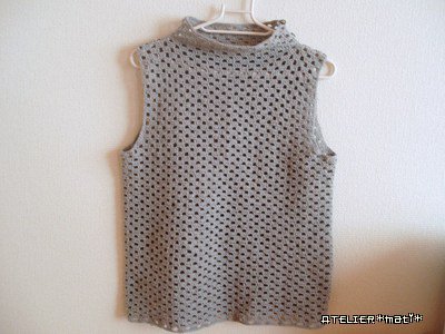 かぎ針ショップ新着編み図 ワッフル模様のタートルネックベスト – 手編みウェア&雑貨の無料編み図 ATELIER *mati*。