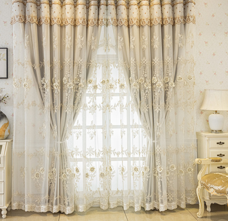 北欧モダン 花のステッチ刺繍のレースカーテン&シェード HS-1577 ベージュ。