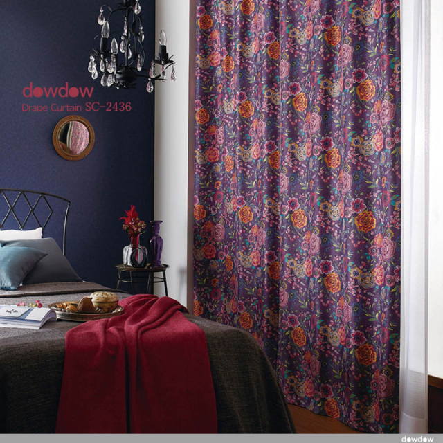 エスニック ビンテージ タッキーな花柄刺繍プリントの遮光カーテン SC-2436 パープル。