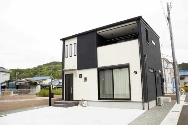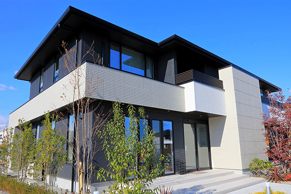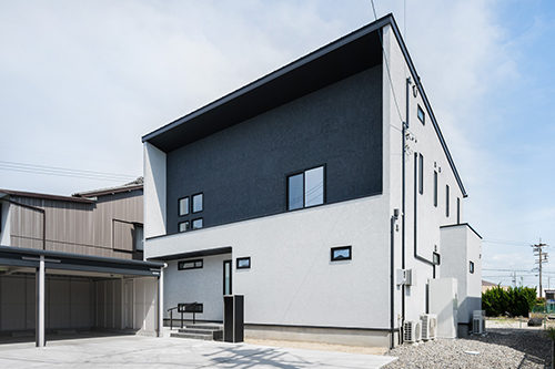 白とグレーを使用したツートンカラーの スタイリッシュな外観 – 住協建設。