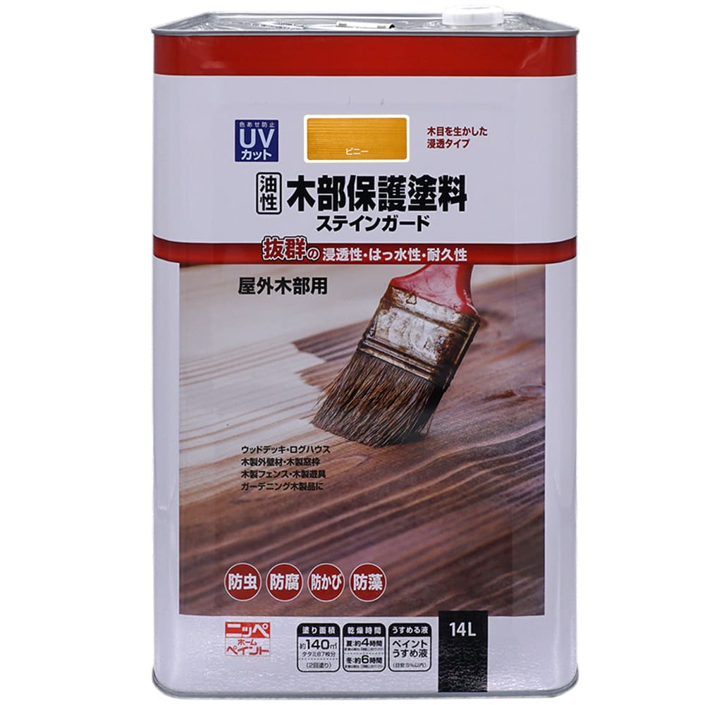 アウトレットセール:20%OFF ウッドデッキ ガーデニング 防虫 防腐 防かび 油性塗料油性木部保護塗料ステインガード 14L カラー名:ピニー ニッペホームオンライン。