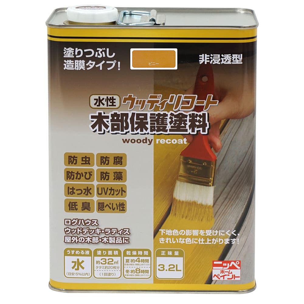 アウトレットセール:20%OFF ウッドデッキ 木部 防虫 防腐 はっ水 水性塗料水性ウッディリコート 3.2L カラー名:ピニー ニッペホームオンライン。